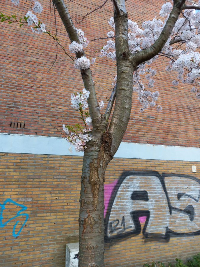Dit lijk op het eerste gezicht heel vreemd. Waarom zou een boom zoals deze uit twee geheel verschillende delen bestaan? Het geheim wordt verklapt als je de boom van iets dichterbij bekijkt. Hierbij zie je namenlijk nog heel duidelijk de entplek zitten: de plaats waar op een onderstam een sierkers is geënt. Door te enten kunnen de beste eigenschappen van verschillende bomen gecombineerd worden. Zoals in dit geval de sterkere groeikracht en beworteling van een kers (mogelijk boskriek?) als onderstam en een japanse sierkers als enthout. Maar duidelijk is te zien dat onder de ent ook de onderstam zelf takken is gaan vormen.