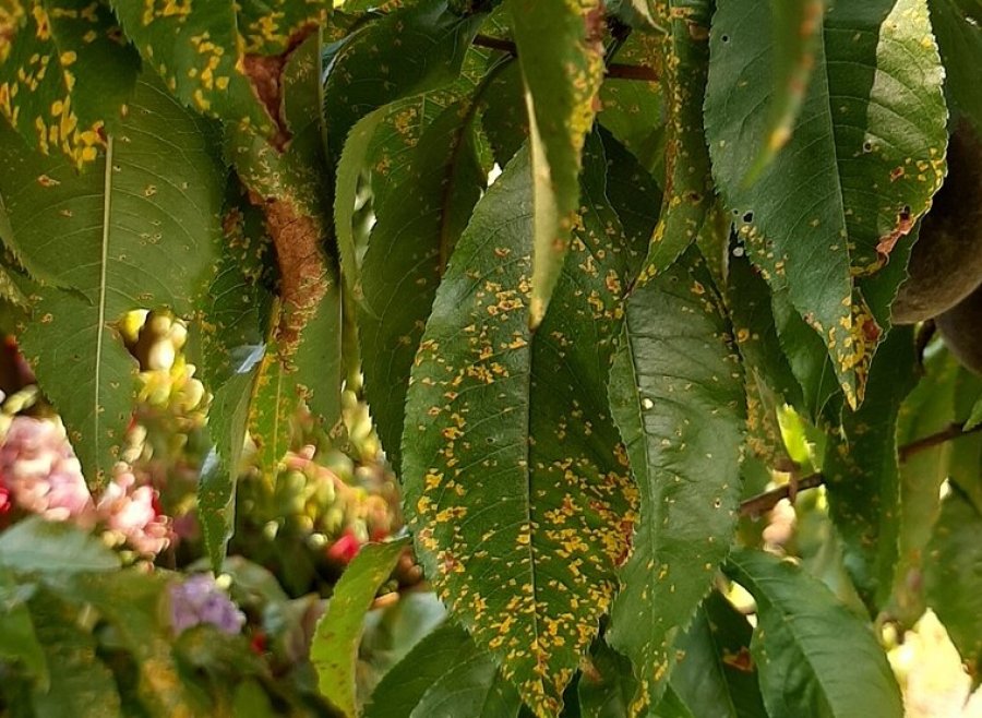 Roest (Perzikroest) | Een schimmel die zich manifesteert als roestkleurige puistjes (sporenhoopjes) op de onderzijde van het blad, vooral laat in het seizoen. Lees verder. |