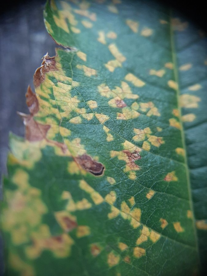 Bovenzijde van het blad: Je ziet kleine, gelige tot bruine vlekjes. Deze vlekken zijn onopvallend in vergelijking met bijvoorbeeld Perzikkrulziekte.