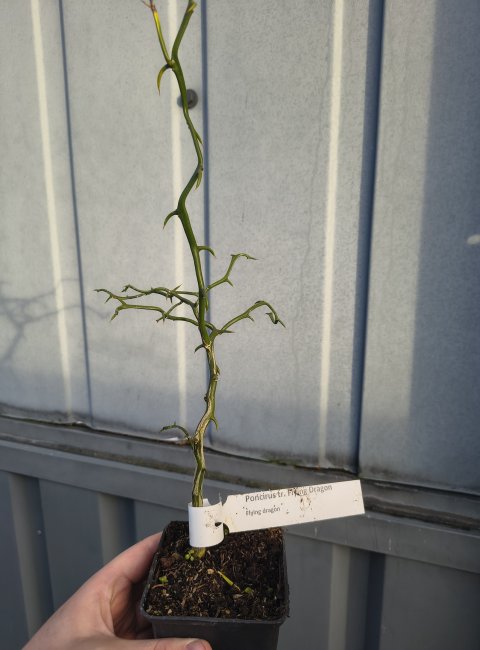 De winterharde citroen 'Flying Dragon' onderscheidt zich van de gewone winterharde citroen door zijn unieke, kurkentrekker-achtig gedraaide takken en compacte groei.